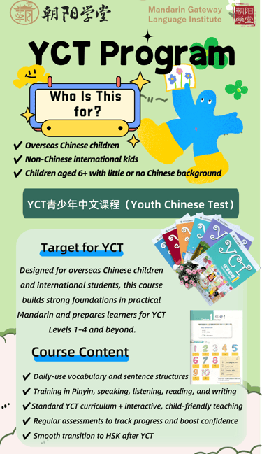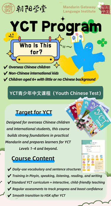 The Youth Chinese Test (YCT) is an international standardized test designed for non-native Chinese learners aged 7 to 16, assessing their abilities in using Chinese in daily communication. It covers listening, reading, and speaking skills, and is divided into different levels from beginner to advanced, serving as an important benchmark for measuring and improving students’ Chinese proficiency worldwide..