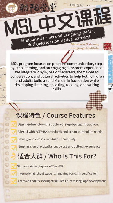 Our MSL (Mandarin as a Second Language) course is designed for non-native speakers, developing listening, speaking, reading, and writing skills through stories, games, and dialogues, while integrating Chinese culture, history, and festivals. Using a graded approach, students progress from beginner level to daily communication and literacy, with a pathway to the GCSE Mandarin curriculum, building a solid foundation for international exams and cross-cultural communication.